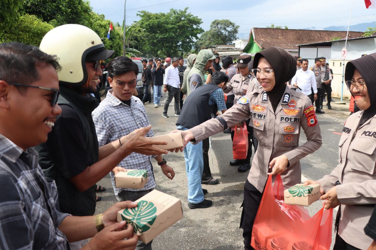 Aksi ini juga diwarnai dengan momen humanis, ketika Polisi Wanita (Polwan) dari Polres Luwu Timur membagikan makanan dan minuman kepada para peserta aksi. Gestur ini disambut positif dan menjadi simbol pendekatan aparat yang tak hanya menjaga keamanan, tetapi juga menunjukkan sikap peduli dan melayani.