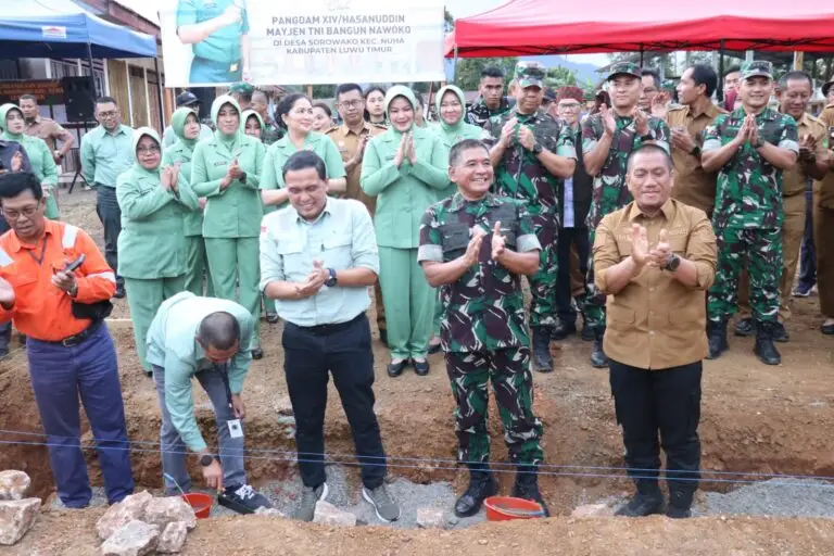 LUWU TIMUR, – Bupati Luwu Timur, Irwan Bachri Syam, bersama Panglima Kodam XIV/Hasanuddin, Mayjen TNI Bangun Nawoko, melaksanakan peletakan batu pertama pembangunan Gerai Koperasi Desa Merah Putih (KDMP) di Desa Sorowako, Kecamatan Nuha, Selasa (13/01/2026).