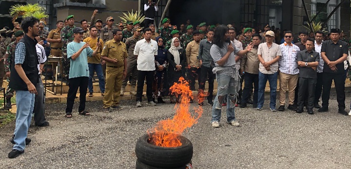 Dalam aksinya, massa membakar ban bekas dan membentangkan spanduk bertuliskan “Mengutuk Sikap Arogansi DPR terhadap Masyarakat” serta “Reformasi Total Institusi Kepolisian.”