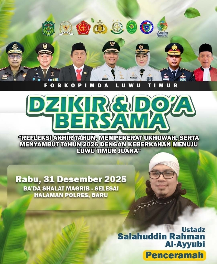 Luwu Timur, — Pemerintah Kabupaten Luwu Timur menggelar zikir bersama dan doa lintas agama dalam rangka menyambut Tahun Baru 2026 sekaligus sebagai bentuk solidaritas kemanusiaan bagi masyarakat terdampak bencana alam di Aceh dan sejumlah wilayah Sumatera. Kegiatan tersebut berlangsung khidmat di Halaman Kantor Polres Luwu Timur, Rabu malam (31/12/2025).