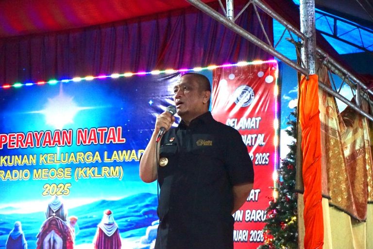 Luwu Timur – Bupati Luwu Timur, Irwan Bachri Syam, menghadiri Perayaan Natal Kerukunan Keluarga Lawado Radio Meose (KKLRM) yang digelar di Desa Tampinna, Kecamatan Angkona. Dalam kesempatan tersebut, Bupati mengajak seluruh masyarakat untuk terus menjaga kerukunan, toleransi, serta ketertiban dalam perayaan hari besar keagamaan, Jumat (26/12/2025).