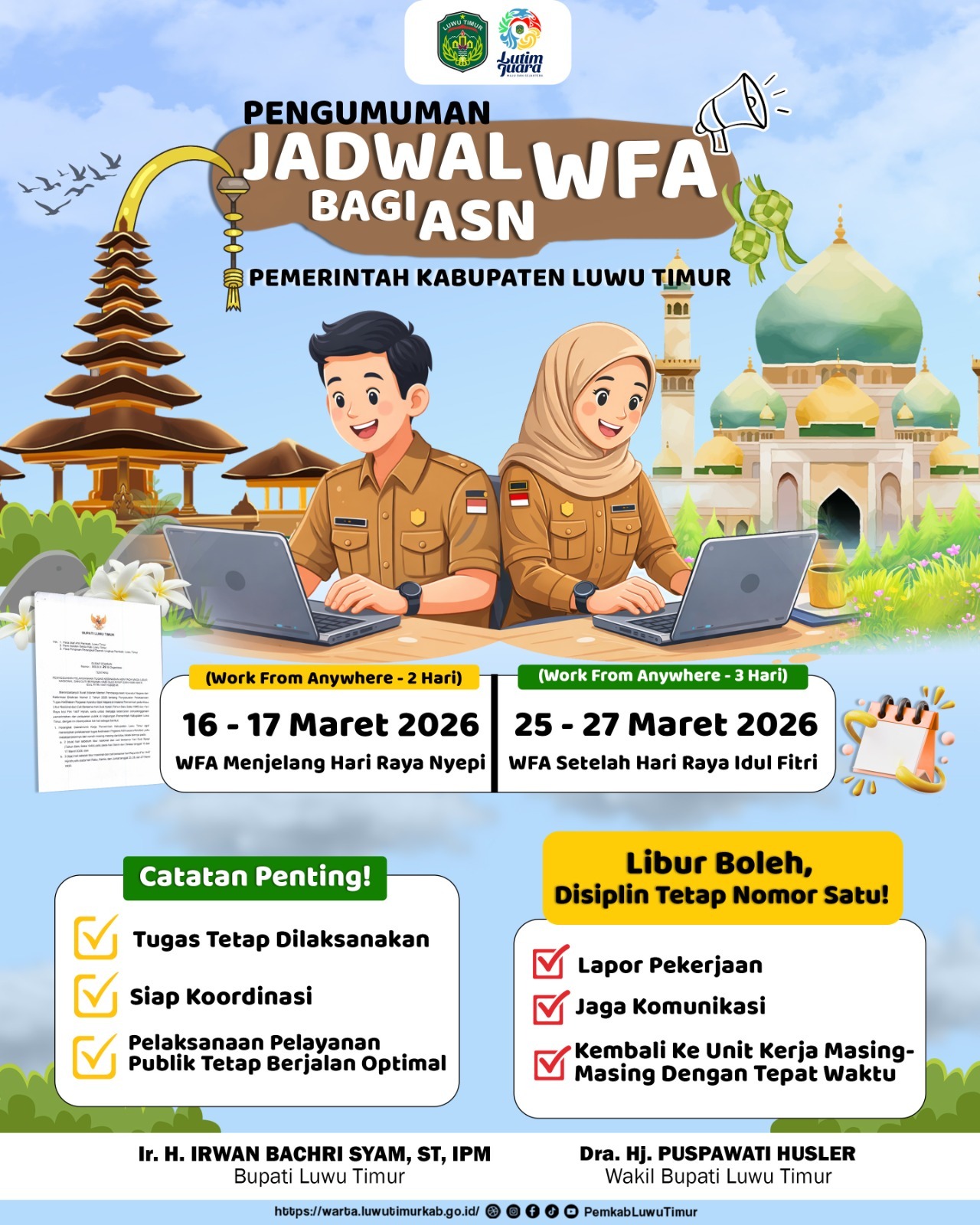 Tomoni Timur, — Pemerintah Kabupaten Luwu Timur menetapkan jadwal Work From Anywhere (WFA) bagi Aparatur Sipil Negara (ASN) pada Maret 2026. Kebijakan ini berlaku dua kali, yakni 16–17 Maret menjelang Hari Raya Nyepi dan 25–27 Maret pasca Idul Fitri.