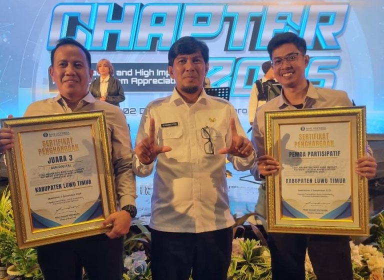 Makassar,Luwu Timur — Kabupaten Luwu Timur kembali menunjukkan kepemimpinannya dalam transformasi digital dengan meraih dua penghargaan sekaligus pada ajang Collaborative and High Impact Payment System Appreciation (CHAPTER) 2025 dan ASN Digital Award yang digelar Bank Indonesia. Penyerahan penghargaan berlangsung di Sandeq Room, Hotel Claro Makassar, Selasa (2/12/2025).